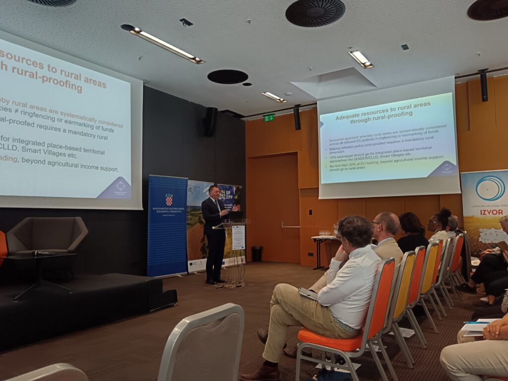 Prisutnima se obratio i g. Piotr Sadlocha, predsjednik ELARD-a i poljske mreže LAG-ova, a čije je izlaganje bilo posvećeno jačanju LEADER-a i CLLD-a unutar NRPP-a u novom programskom razdoblju, uz obvezu namjenskog izdvajanja sredstava te pregledu modela provedbe LEADER/CLLD-a u Poljskoj u prošlom i za novo programsko razdoblje 2028.-34. U nastavku je Edina Ocsko, članica EU Mreže Pametnih sela i potpredsjednica Koordinacijske skupine Ruralnog pakta iznijela njegove ključne preporuke za politike razvoja ruralnih područja nakon 2027. Ovaj skup izlaganja završio je prezentacijom gđe Betty-Ann Bryce iz organizacije za ekonomsku suradnju i razvoj (OECD) koja je ovom prilikom naglasila važnost stvaranja politika temeljenih na dokazima i Rural proofing. Prvi dio dana završio je panel raspravom prethodno spomenutih izlagača.