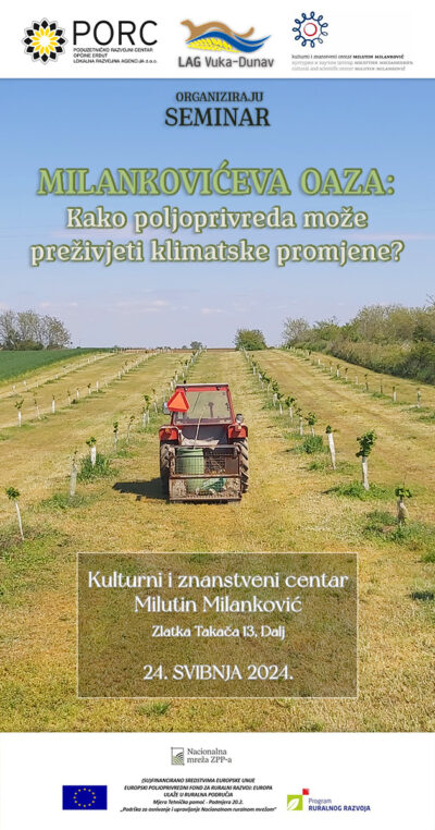 Poduzetničko-razvojni centar općine Erdut lokalna razvojna agencija d.o.o. s partnerima Kulturnim i znanstvenim centrom Milutin Milanković i LAG-om Vuka – Dunav organiziraju seminar: „Milankovićeva oaza“ na temu utjecaja klimatskih promjena na poljoprivredu, koji će se održati 24. svibnja 2024. godine u prostoru Kulturnog i znanstvenog centra Milutin Milanković u Dalju, Zlatka Takača 13.